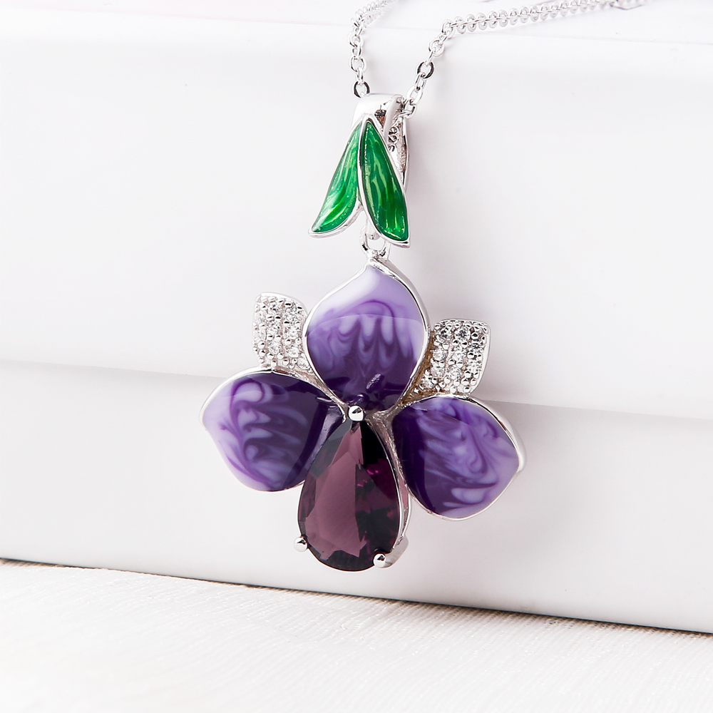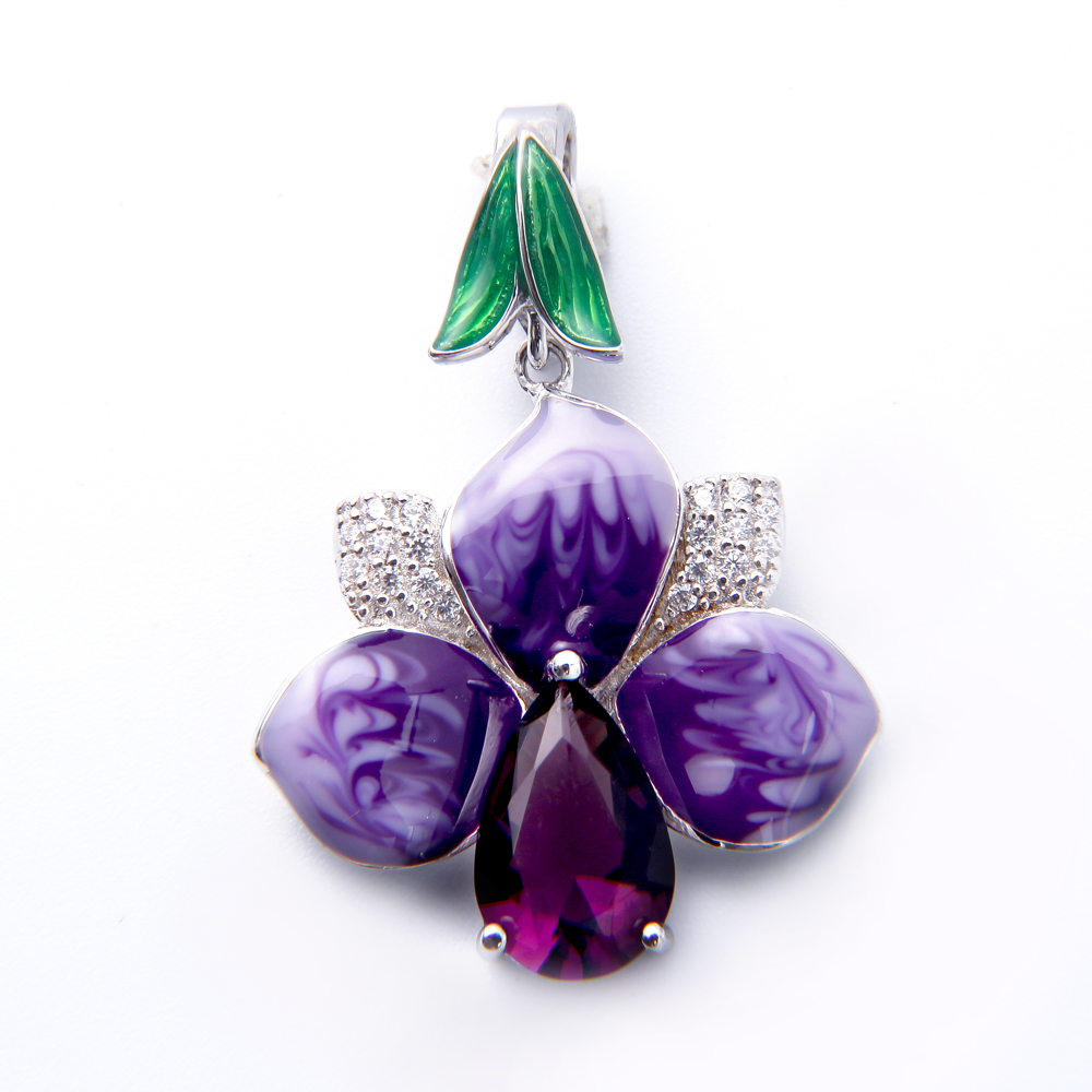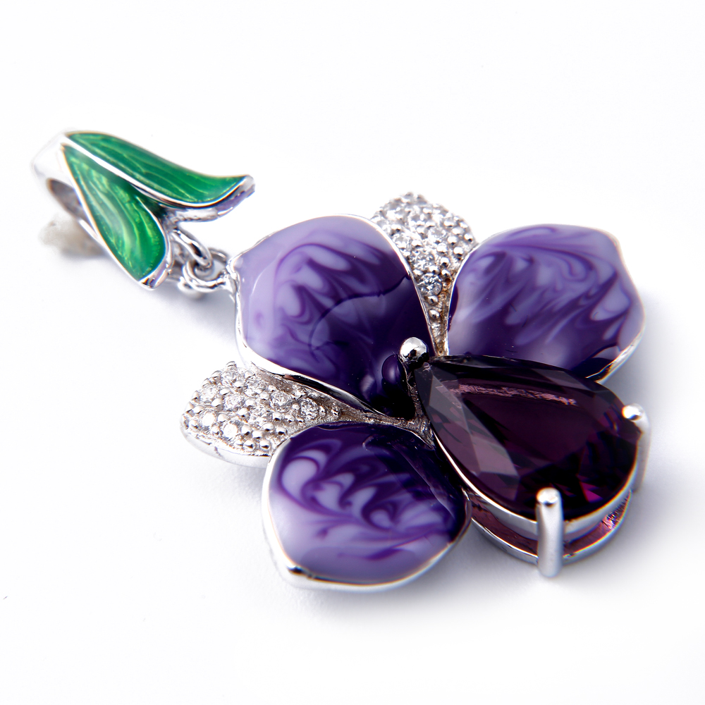 以925纯银作为设计花吊坠的基础。并将紫水晶玻璃杯成为这款珠宝吊坠上的主要石头。整个
