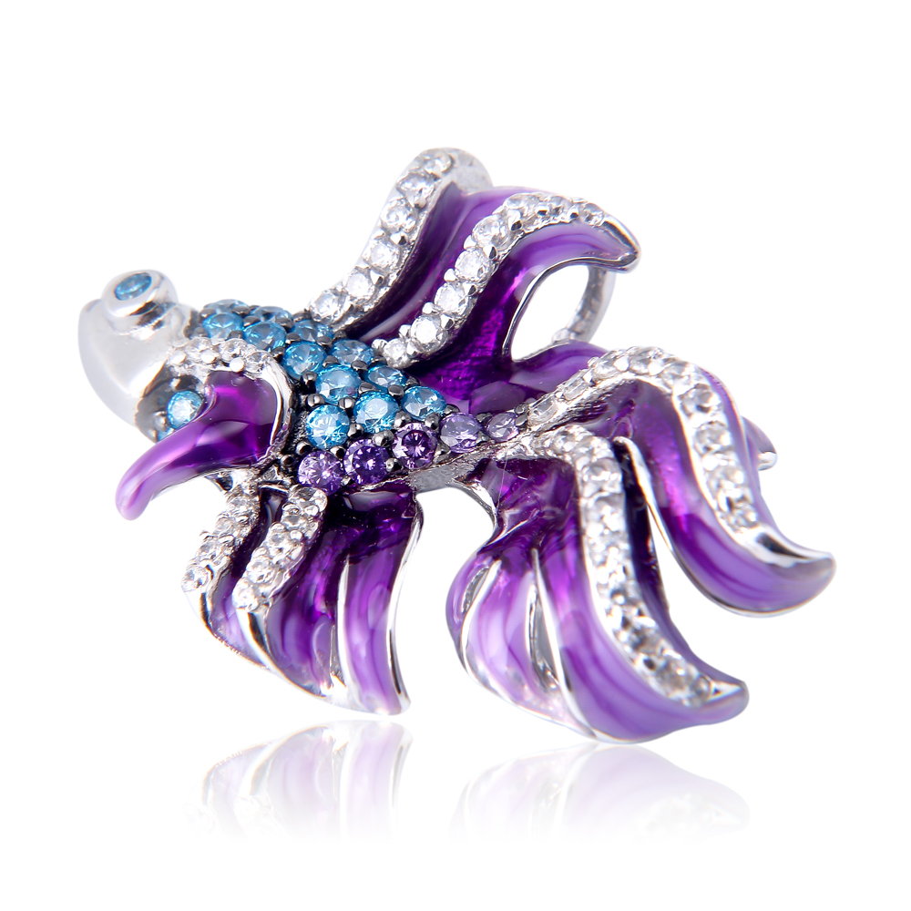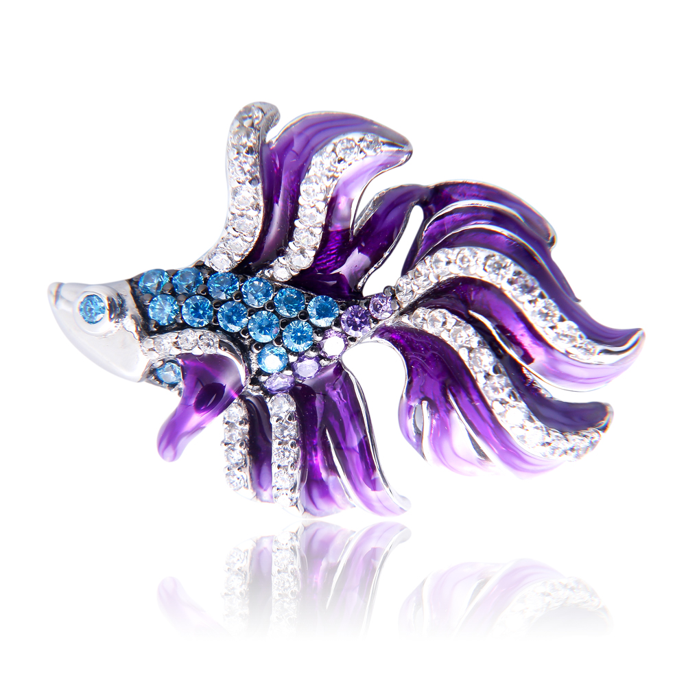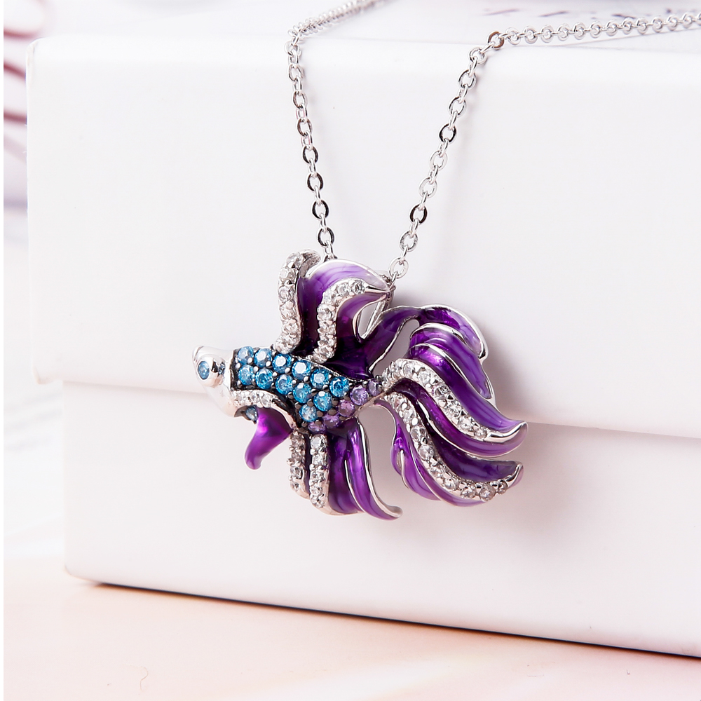 925纯银鱼 珠宝吊坠 用18k的银色镀银,用三种彩色石头,如白色锆石,蓝色海蓝宝石和紫色紫水晶。